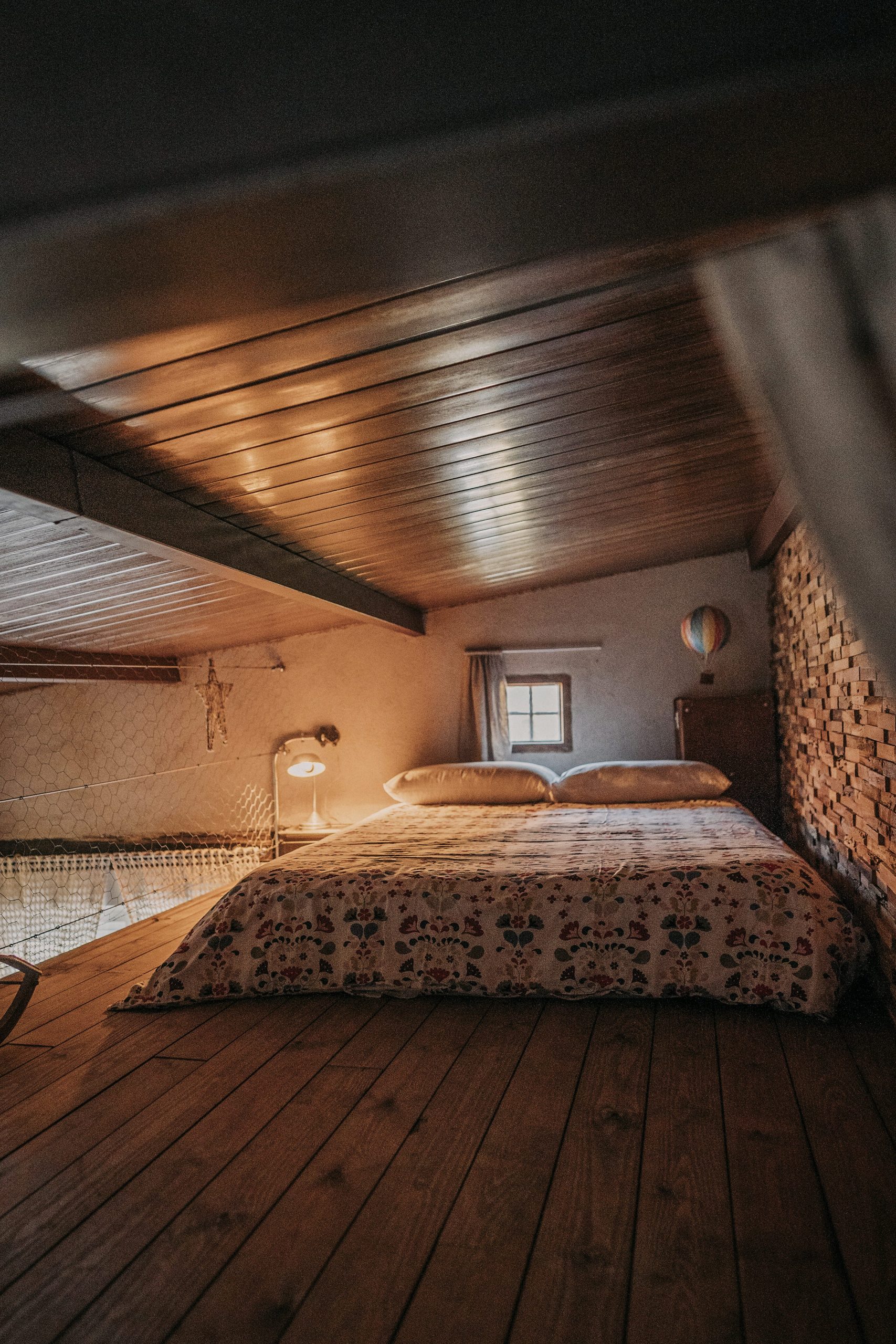 La habitación se encuentra en un altillo, desde el que se tiene una vista panorámica de todo el alojamiento, disfrutando así de él sin perder la visión y sentirte arropado por toda la estancia. También dispone de un sofá cama abajo en el salón.